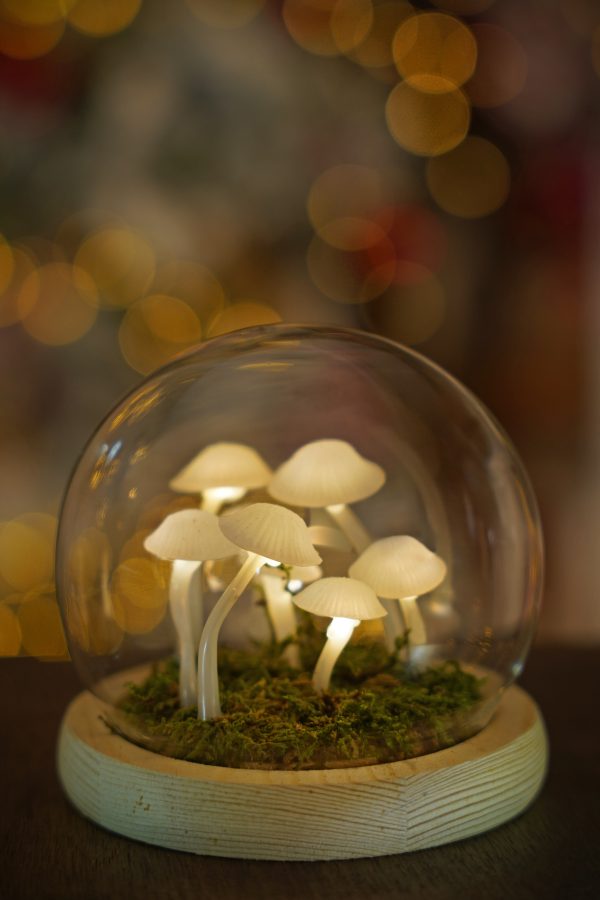 A kis alkotás 1 darab CR2032-es elemmel üzemel, a gombákat igazi moha öleli körül.