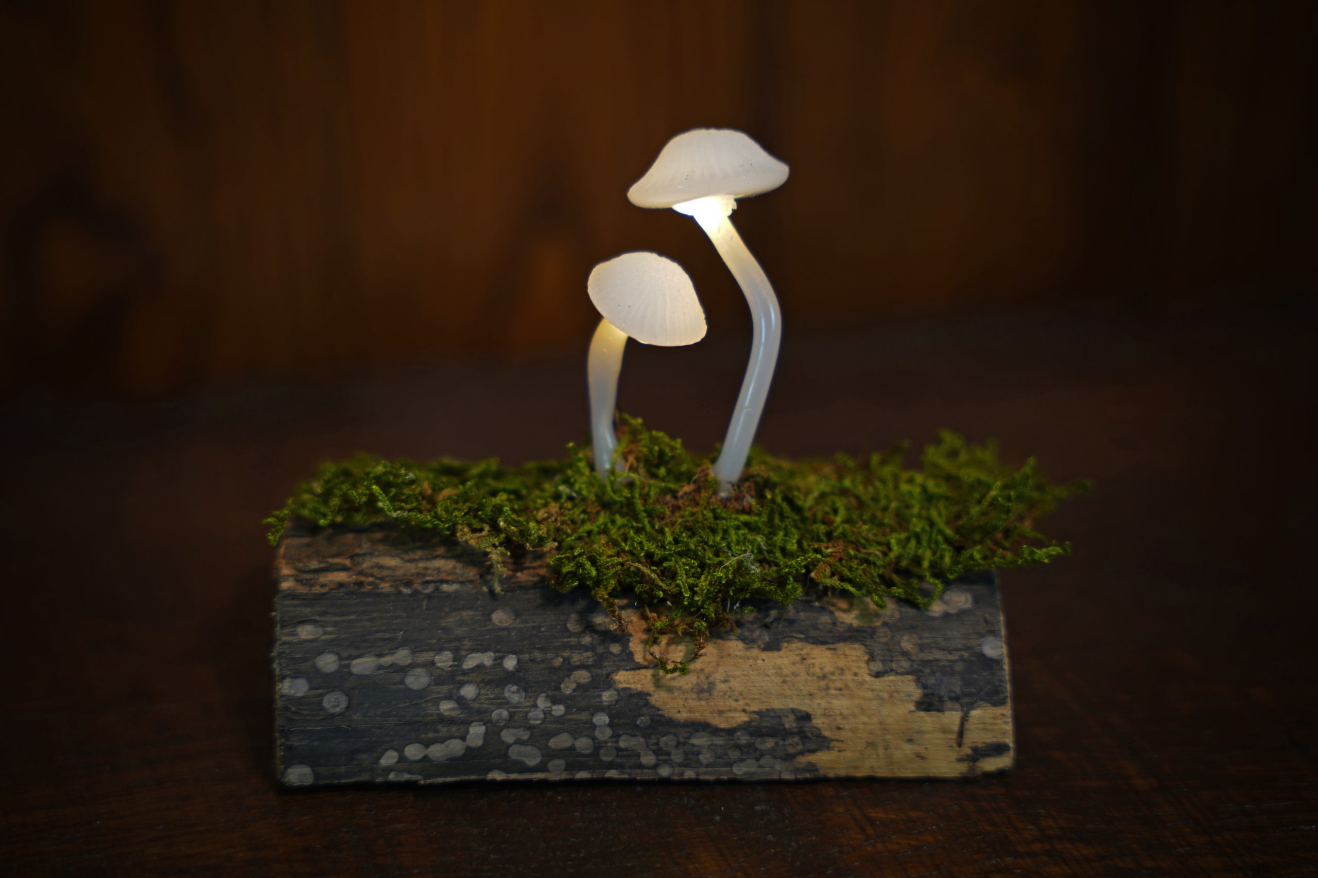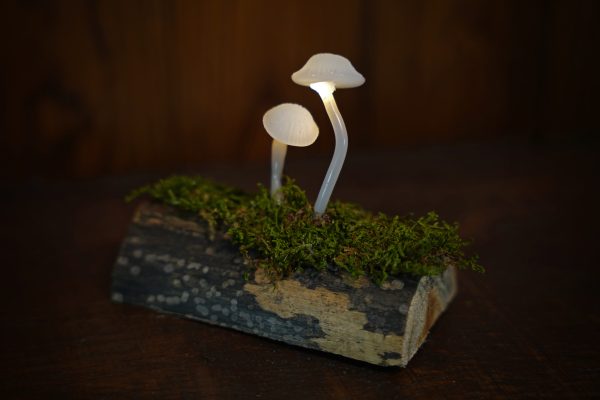 A két kis búbos kalapos gomba egy kis fatörzsön talál egymásra, miközben moha öleli körül őket.
